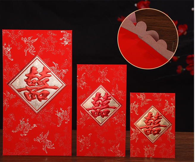 Tiếp theo là mẫu bao lì xì với chữ song hỉ với những họa tiết hoa văn được thiết kế tinh xảo mầu đỏ đẹp mắt thiết kế tinh xảo.